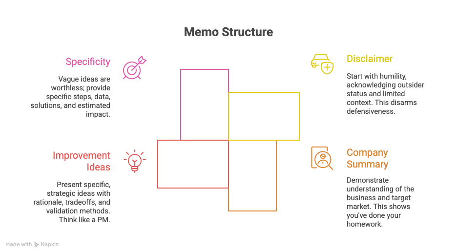 Example: "I'm writing this as someone who's spent the last week studying your product and talking to a few users. I don't have internal context on your roadmap or constraints, so some of these ideas might not be feasible. But I wanted to share my thinking in case it's helpful."